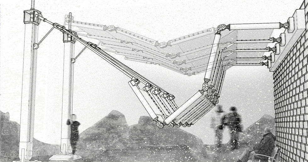 The recent progress on the Gravesend Installation project explores a kinetic canopy over the cleaned-up vegetation surrounding Cliffe fort, facing towards the Thames and using benches the site has become a unique destination for travellers to rest.